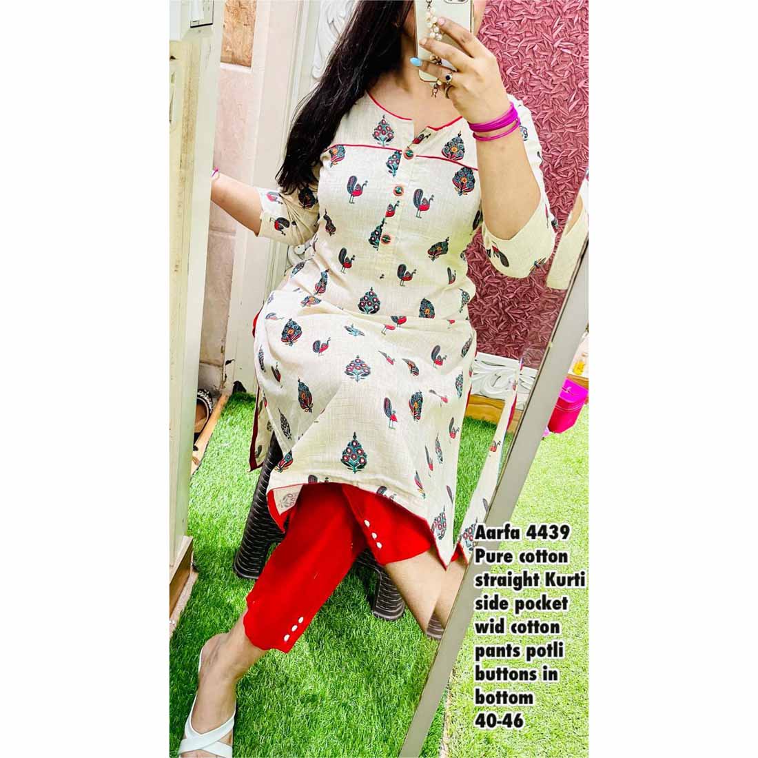 Pure Cotton Straight Kurti Side Pocket Wid Cotton Pants Potli Buttons In Bottom For Women By Simishop
